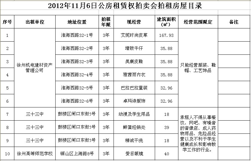 1、徐州淮海西路32#自東向西1-6號(hào)門面房共6間,建筑面積分別為167.93㎡、 35.88㎡、32.96㎡。以上房屋僅限經(jīng)營服裝、鞋帽、工藝飾品。