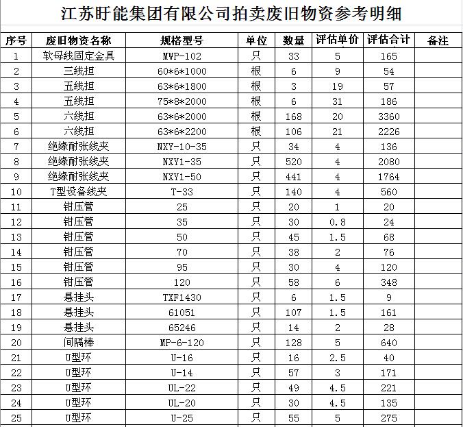 關(guān)注微信公眾號受江蘇盱能集團有限公司委托,我公司將通過中國拍賣行業(yè)協(xié)會網(wǎng)絡(luò)拍賣平臺以網(wǎng)絡(luò)競價的方式公開拍賣廢舊物資一批,主要包括:電纜、金具、線管、開關(guān)等(詳見拍品目錄)。