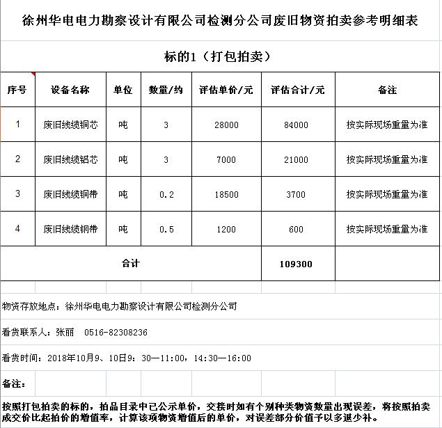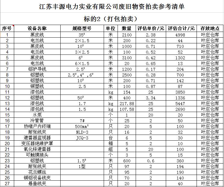 關(guān)注微信公眾號受江蘇徐供集體資產(chǎn)運營中心委托,我公司將通過中國拍賣行業(yè)協(xié)會網(wǎng)絡拍賣平臺以網(wǎng)絡競價的方式分兩批公開拍賣其下屬三家集體企業(yè)廢舊物資,主要包括:廢舊電纜、纜芯、鋼帶、導線、開關(guān)、電表、金具、廚房設備等(詳見拍品目錄)。