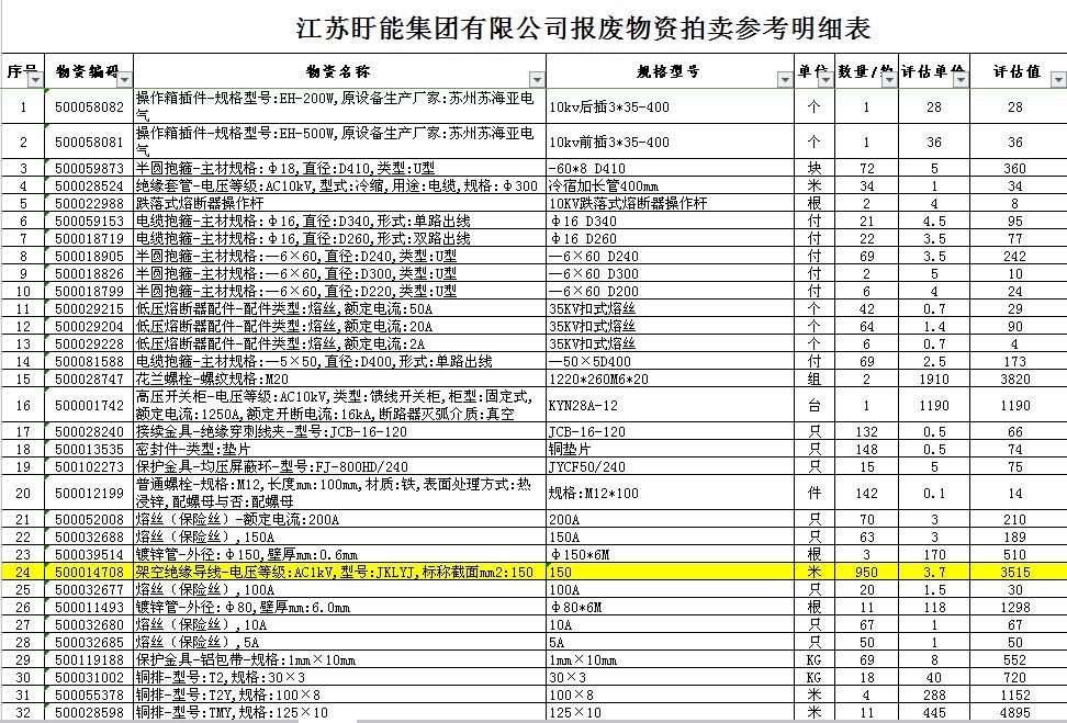 關(guān)注微信公眾號受江蘇盱能集團(tuán)有限公司委托,我公司將通過中國拍賣行業(yè)協(xié)會網(wǎng)絡(luò)拍賣平臺以網(wǎng)絡(luò)競價(jià)的方式公開拍賣以下廢舊物資,主要包括:各型廢舊電纜、變壓器拆解件、五金、金具、鋼芯鋁絞線、開關(guān)、配電柜等。