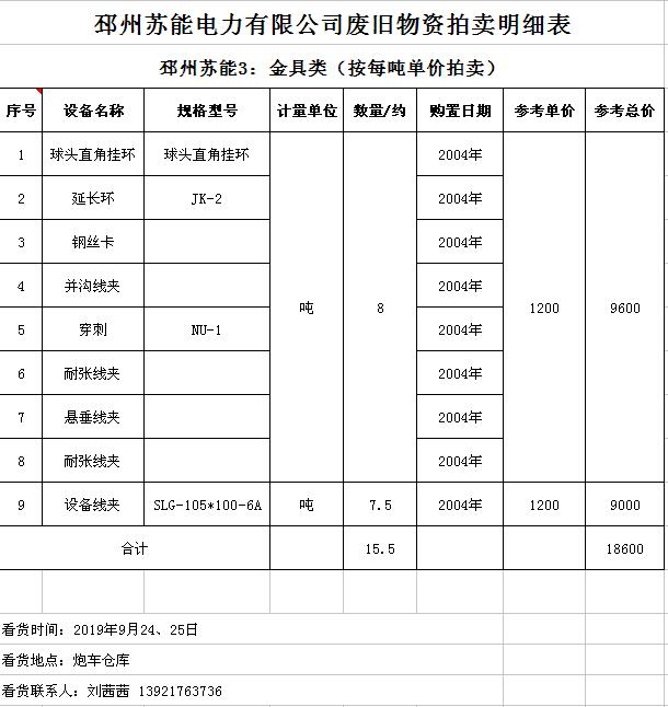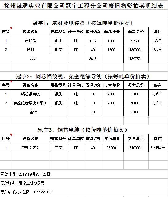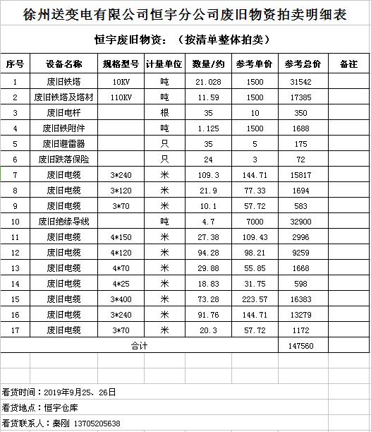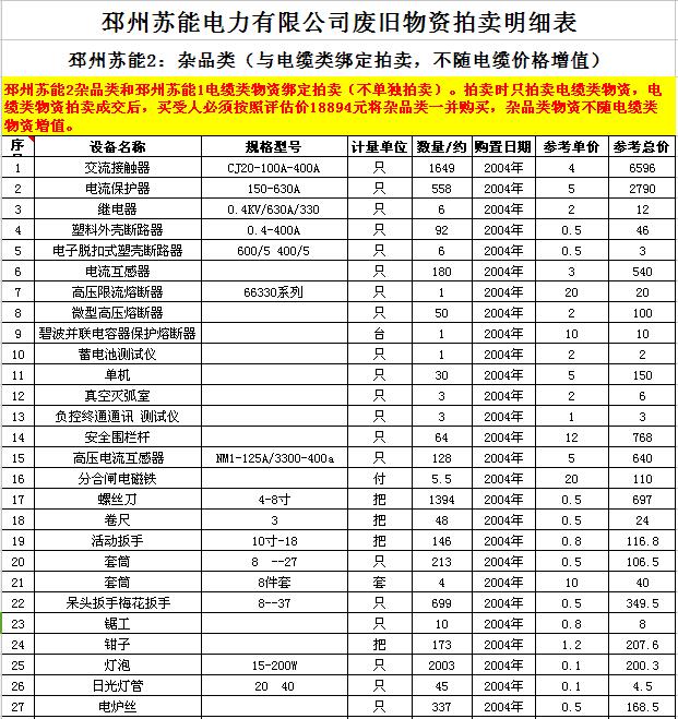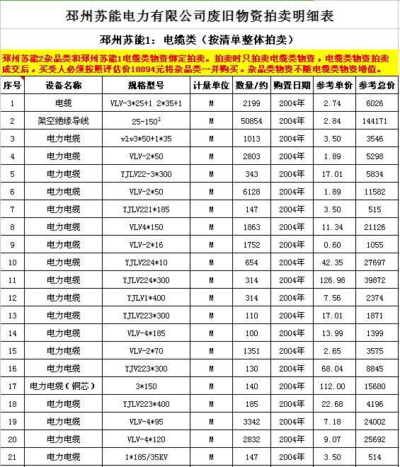 關(guān)注微信公眾號受委托,我公司將通過中國拍賣行業(yè)協(xié)會網(wǎng)絡(luò)拍賣平臺以網(wǎng)絡(luò)競價(jià)的方式公開拍賣廢舊電力物資一批,主要包括:電纜、導(dǎo)線、廢舊鋼材、鋼芯鋁絞線、金具、雜品、機(jī)具、空調(diào)、辦公設(shè)備等。