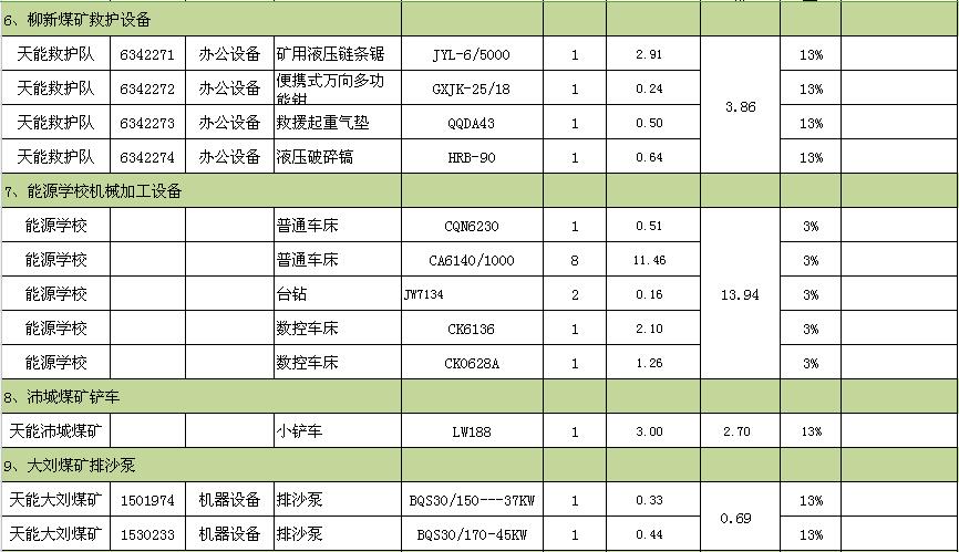 裝載機(jī)、通風(fēng)機(jī)、綜掘機(jī)、變壓器、鏟車、叉車、排沙泵、汽車衡、繪圖儀、救護(hù)設(shè)備、機(jī)械加工設(shè)備、測(cè)量設(shè)備等。