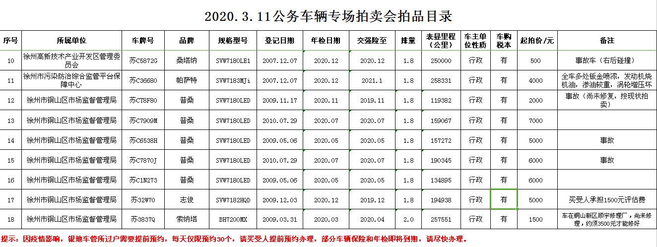 受委托,我公司定于2020年3月11日13:00時(shí)在徐州市銀地二手車交易市場(chǎng)四樓東南拍賣大廳通過現(xiàn)場(chǎng)和汽車街網(wǎng)絡(luò)拍賣平臺(tái)同步進(jìn)行的方式公開拍賣以下公務(wù)車輛: