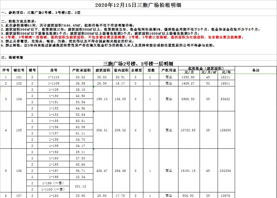 關(guān)注微信公眾號我公司受委托,定于2020年12月15日10時在徐州市中山南路55號三樓本公司拍賣廳公開拍租:新盛集團位于三胞廣場商鋪及辦公房一批,面積分別為數(shù)十至數(shù)百平米不等,均為閑置。租期3-5年。禁止從事危險品、有污染及擾民的行業(yè)經(jīng)營。