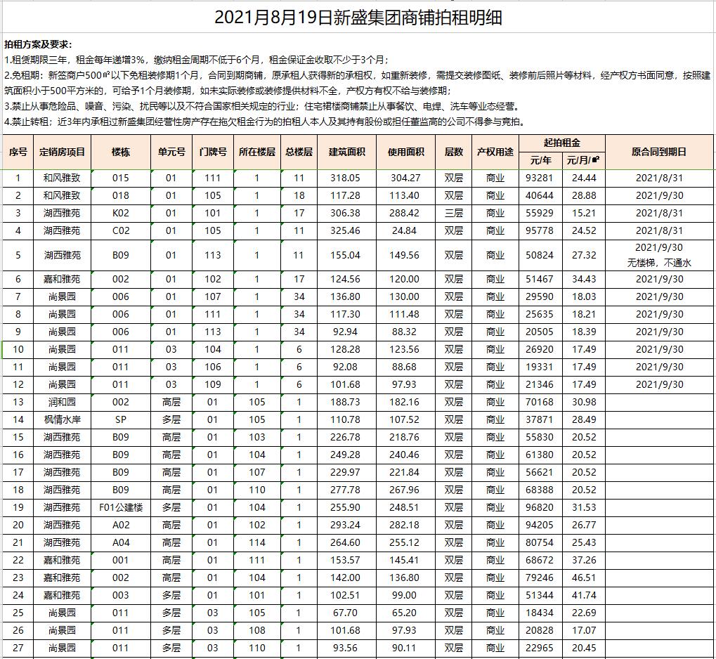 關(guān)注微信公眾號我公司受委托,定于2021年8月19日10時在徐州市中山南路55號本公司拍賣廳公開拍租以下商鋪:湖西雅苑10間、嘉和雅苑4間、尚景園13間、玉潭佳苑3間、康馨園3間、楓情水岸1間、潤和園1間、天瑞華府1間、和風(fēng)雅致2間。面積分別約為數(shù)十至三百余平米不等,租期均為三年。